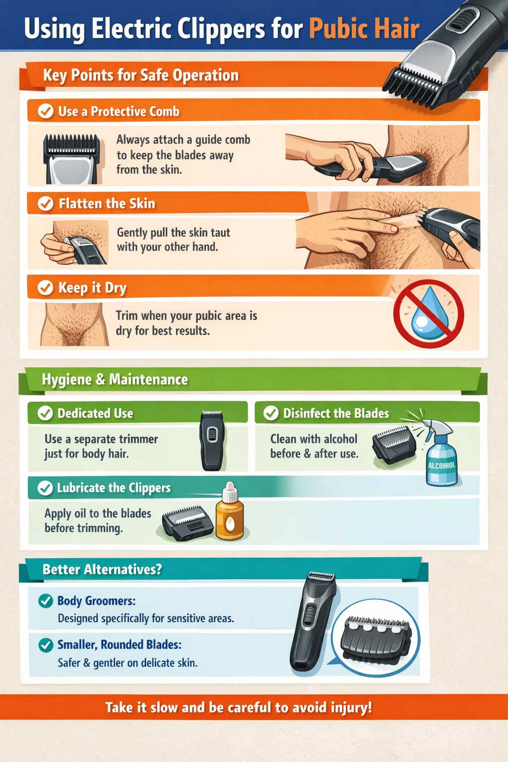 Usage dédié : Pour des raisons d’hygiène, il est préférable de ne pas utiliser la même tondeuse pour les cheveux et les poils pubiens. Si possible, préparez une petite tondeuse spécialement conçue pour les poils du corps. Si vous devez partager, veillez à bien désinfecter les lames avec de l'alcool avant et après utilisation.