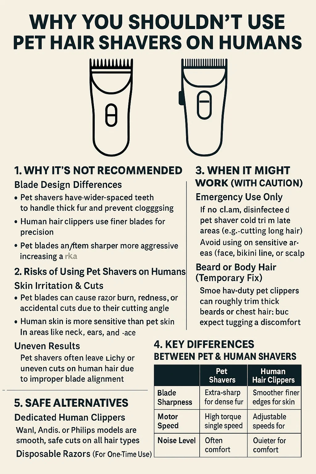 Alors que rasons de poils d'animaux Et les tondeuses à cheveux humaines peuvent ressembler à des différences de conception et de sécurité clés. Voici une ventilation détaillée: