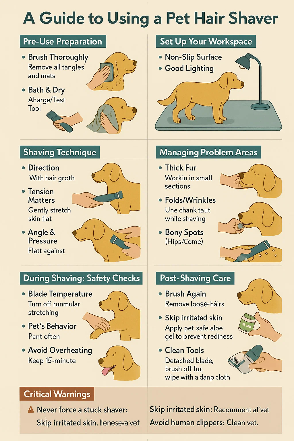 Évitez la surchauffe: raser à des intervalles de 15 minutes; Donnez les pauses de l'outil (et de l'animal).