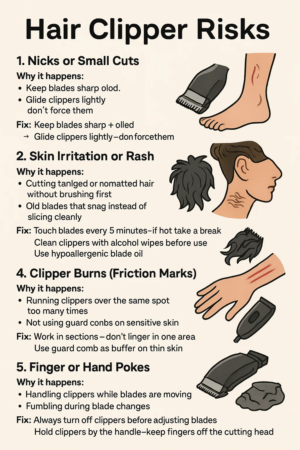 Oui, en utilisant un tondeuse à cheveux peut entraîner des blessures mineures ou un inconfort s’il n’est pas manipulé avec précaution. Voici une ventilation simple des risques courants et comment les éviter :